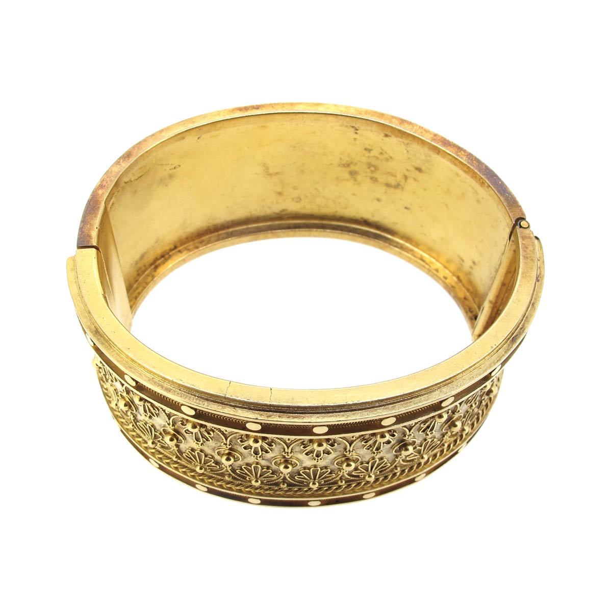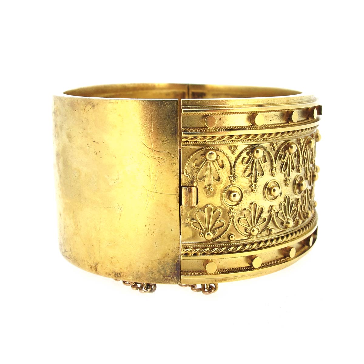 Antique Victorian Etruscan revival 15 carat gold cuff bangle. Hallmarked Chester 1883. Width 30mm, diameter 58mm.