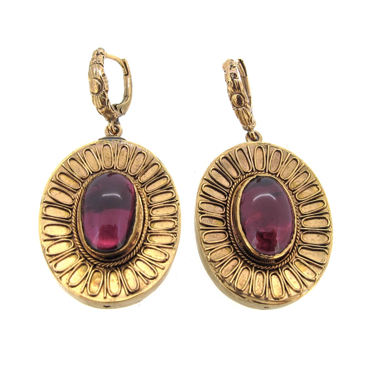 Antique Victorian cabochon garnet & carved 15 carat gold earrings. Total length 40mm, width 20mm.