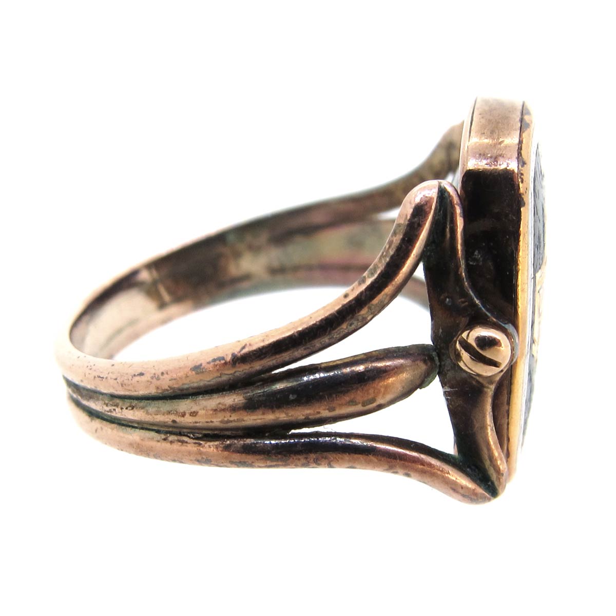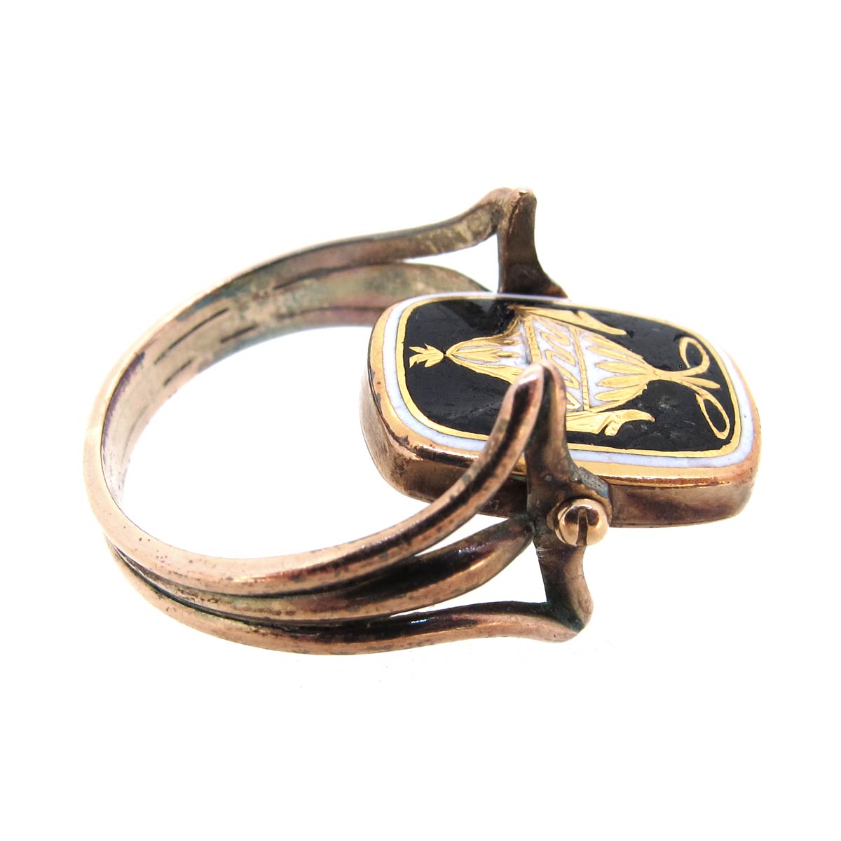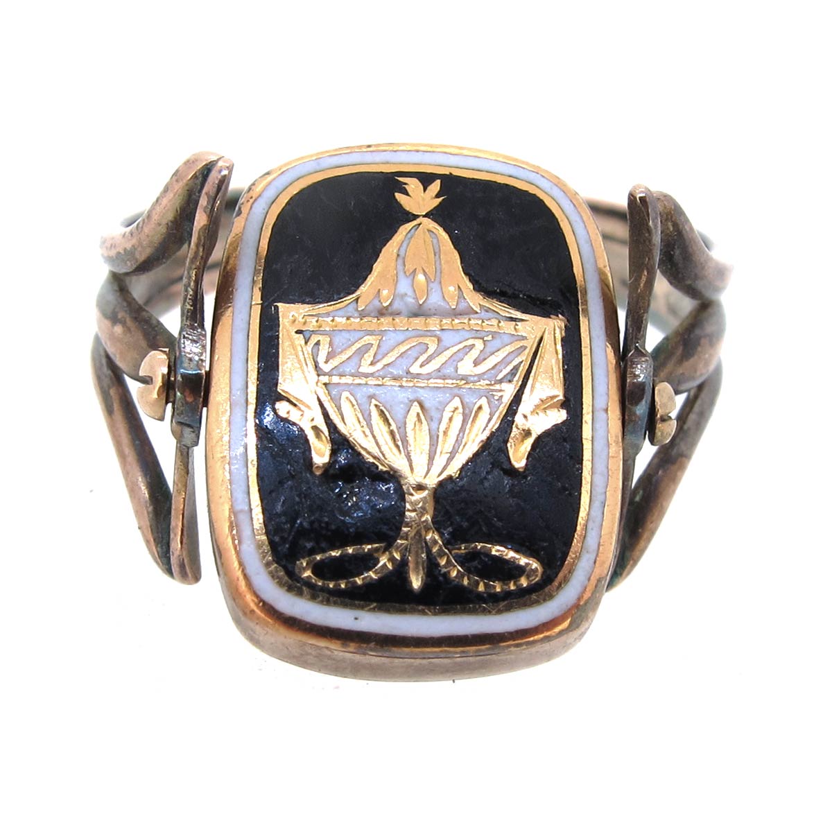 Georgian, 1807, 15 carat gold & enamel mourning ring. Central spinning section with black & white enamelled urn motif to the front & engraved open hair locket section to the reverse. With split shoulders.
