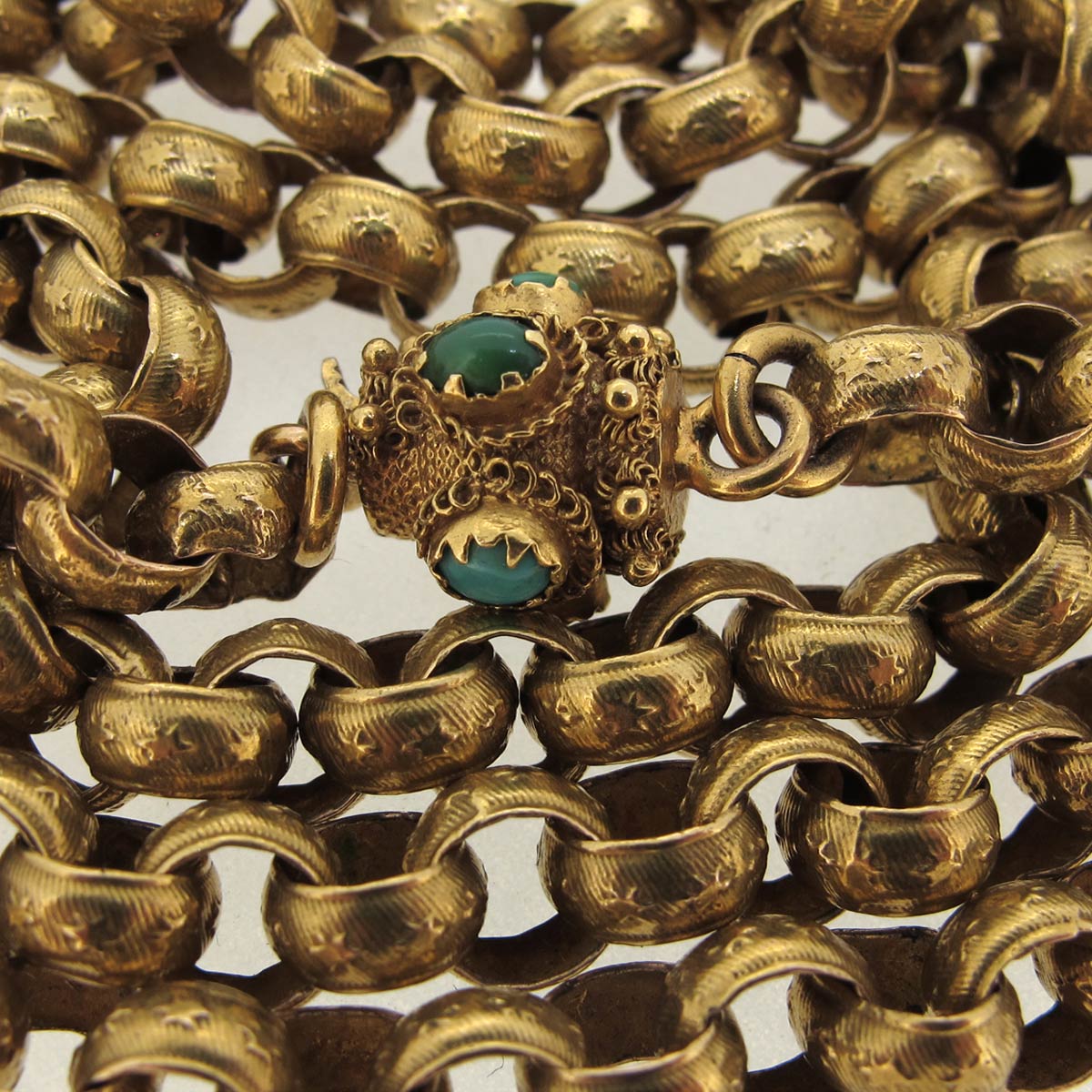 Antique Georgian 15 carat gold star link belcher chain. With stars embossed on every link & a barrel clasp set with turquoise. Weight 41.38 grams, length 41″.