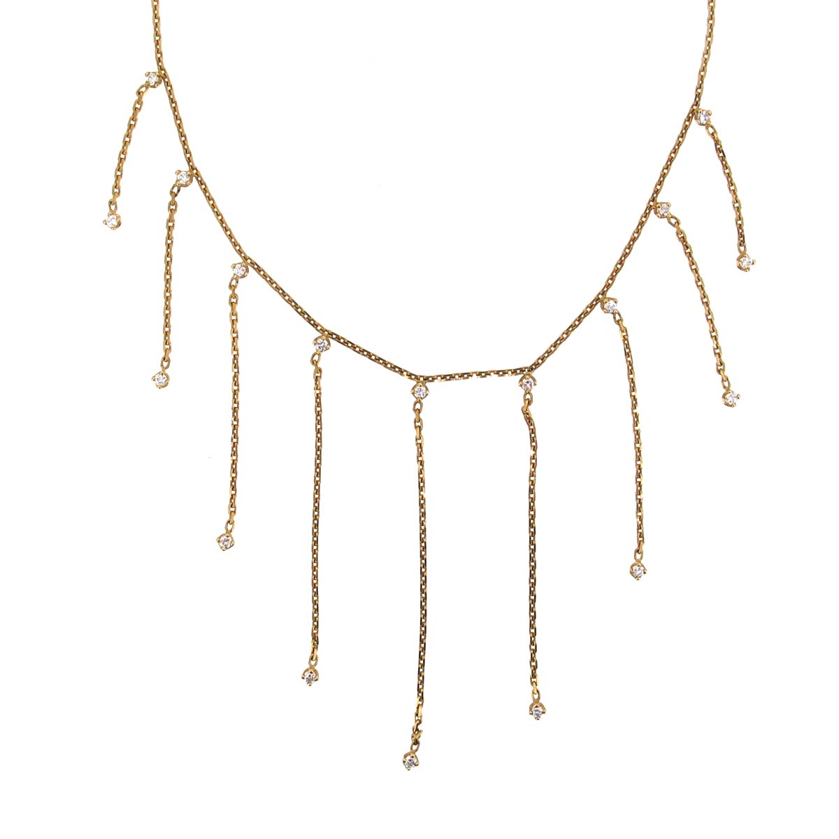 18 carat gold & diamond necklace. Nine chains of graduating length suspended from a central chain, with a diamond set to the top & bottom of each chain.