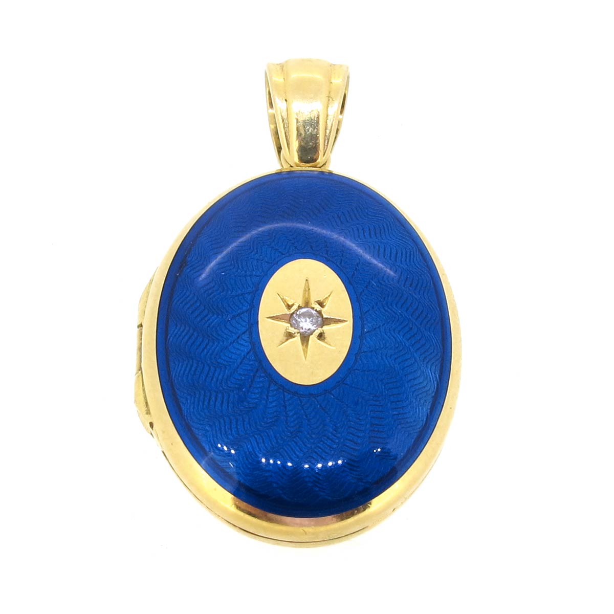 Vintage 18 carat gold, blue guilloche enamel & star set diamond locket. Holds 2 pictures. Size 25 x 19mm.