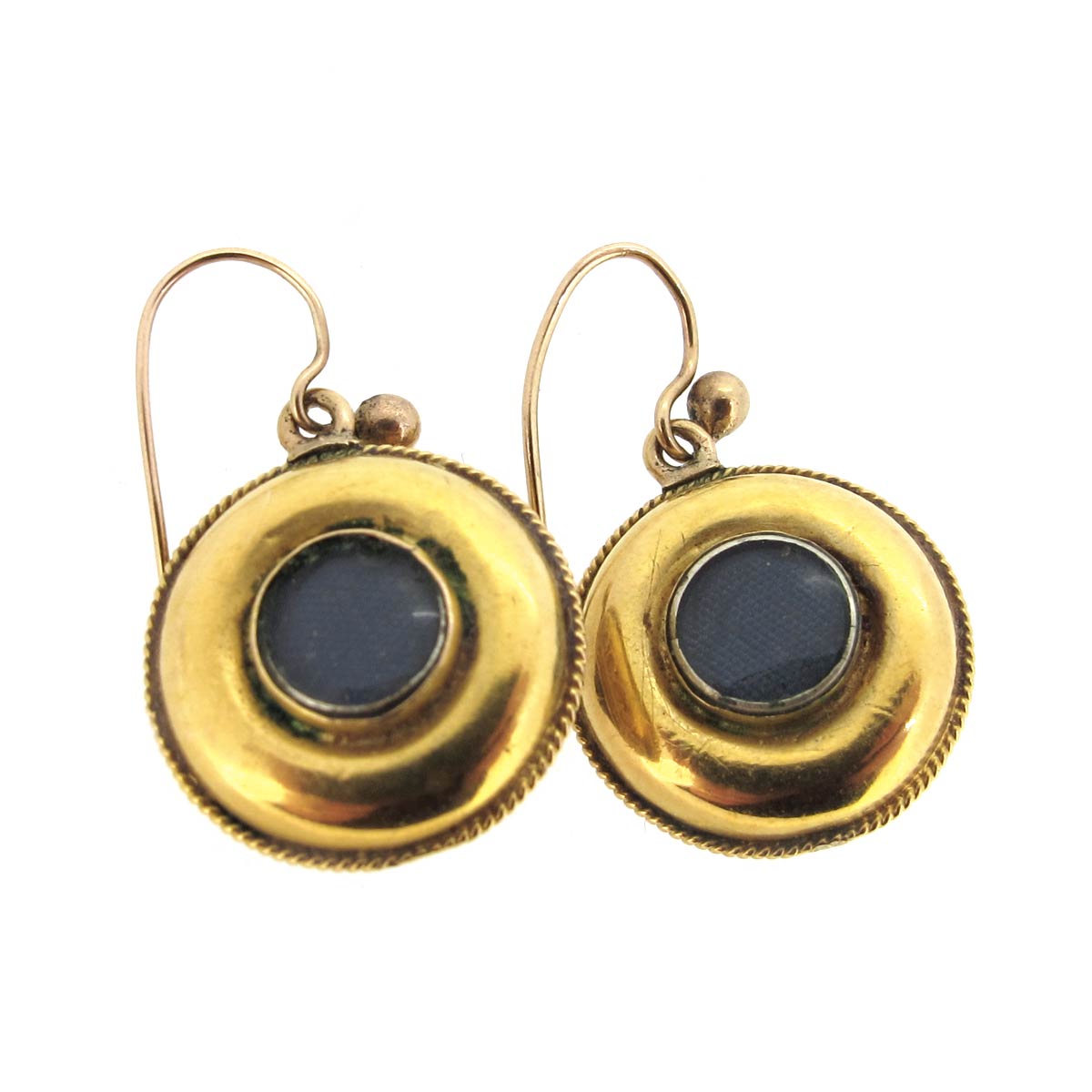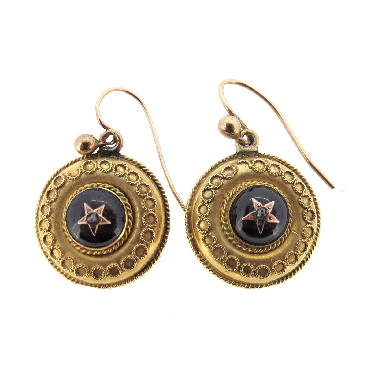 Antique Victorian 15 carat gold, garnet & rose cut diamond earrings. Central cabochon garnet with a gold inlaid star & tiny rose cut diamond surrounded by gold with gold wirework detail. Locket section to the reverse. Diameter 15mm.