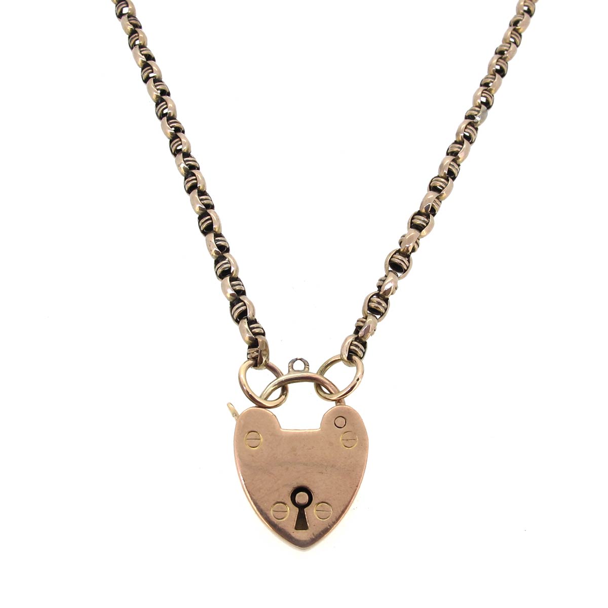 Antique 9 carat rose gold necklace with heart padlock pendant. Length of chain 18″.