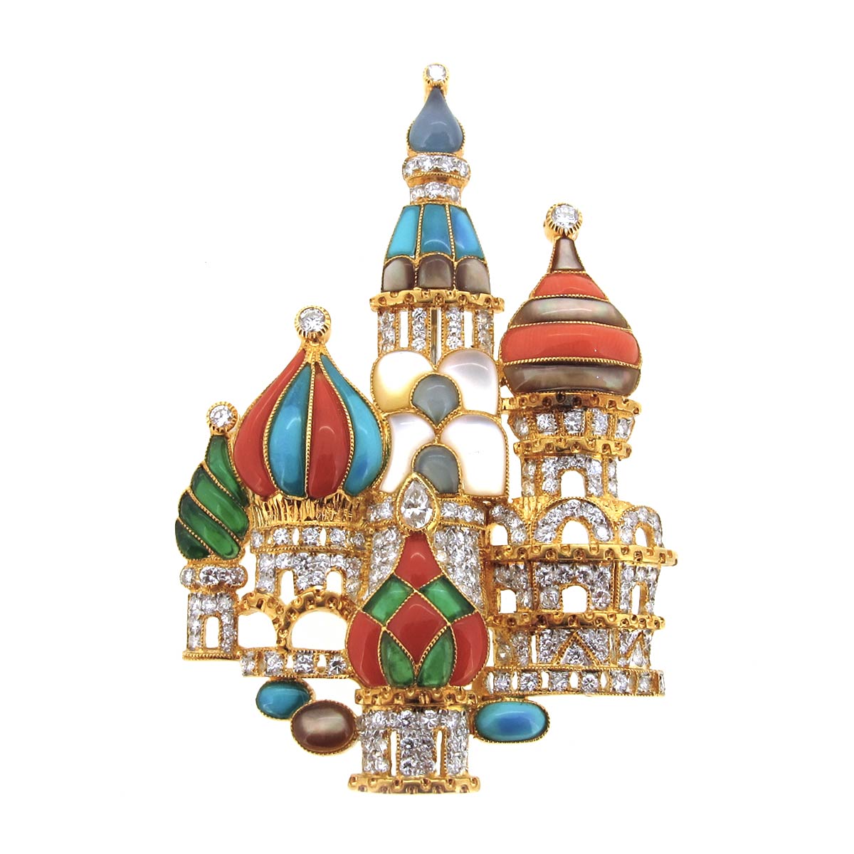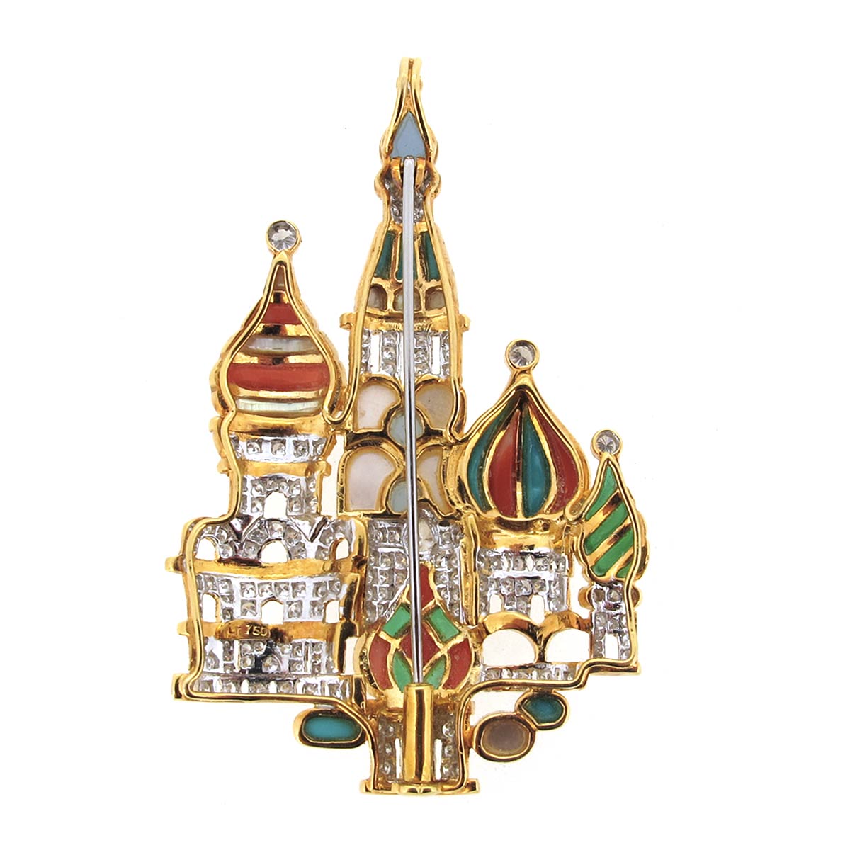 18 carat gold set coral, turquoise, mother of pearl, sapphire, moonstone, emerald/ agate & diamond St Basel’s Cathedral brooch/ pendant. Weight 18.78 grams. Size 60x39mm.