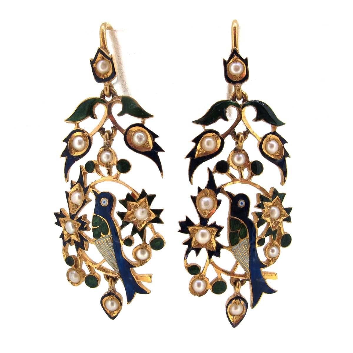 Antique 18 carat gold with pearls & blue, green & white enamel bird earrings.