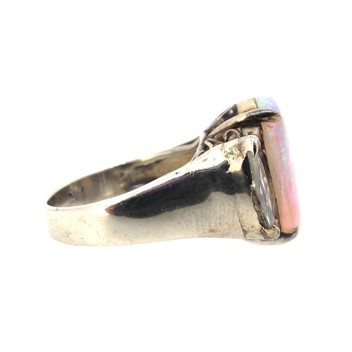 Vintage mid-century opal & diamond cocktail ring. Central oval shaped opal with a marquise shaped diamond set to either side. In 14 carat gold.