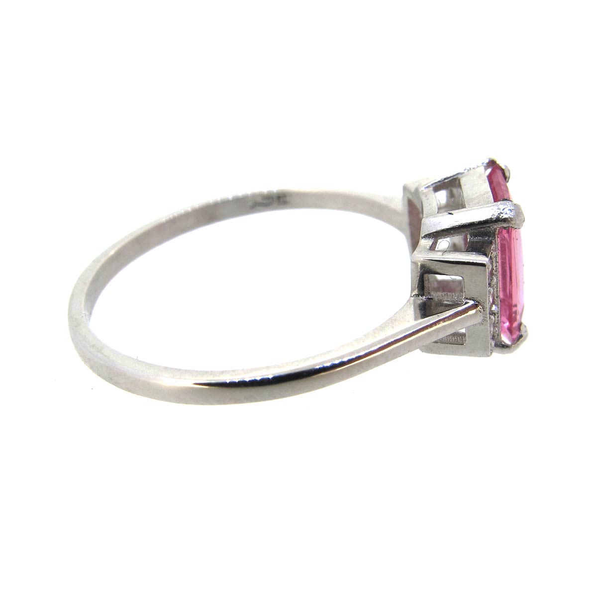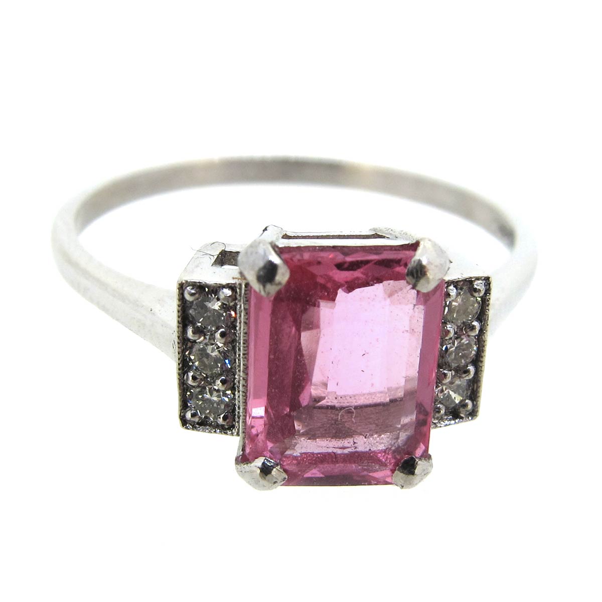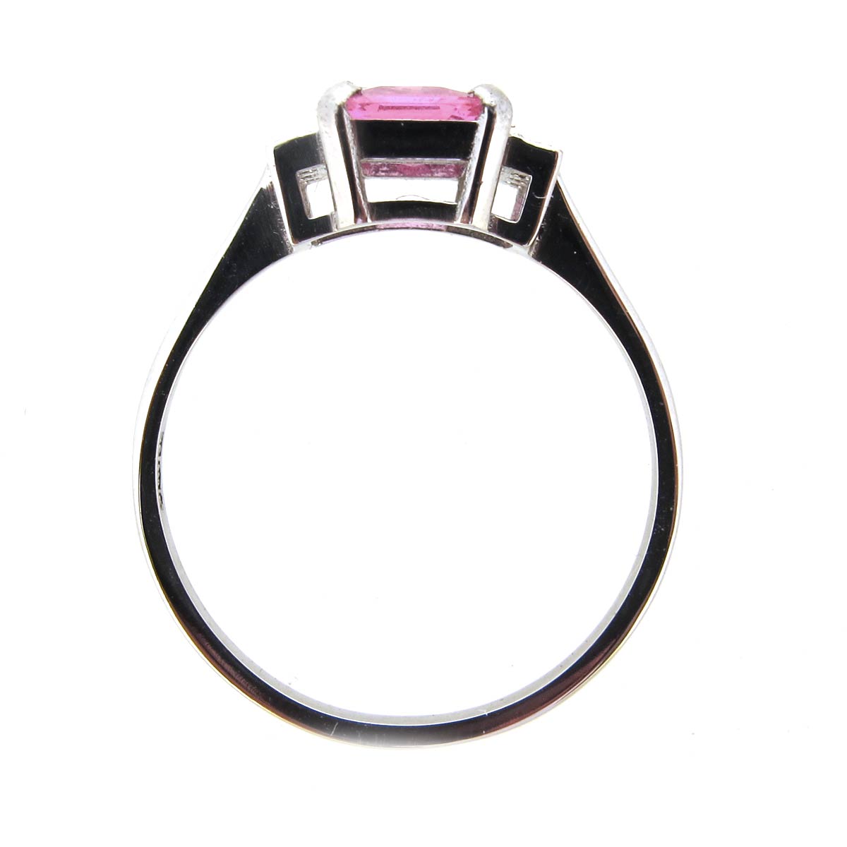 Art Deco style emerald cut pink sapphire ring set in platinum. With 3 diamonds set to either side.
