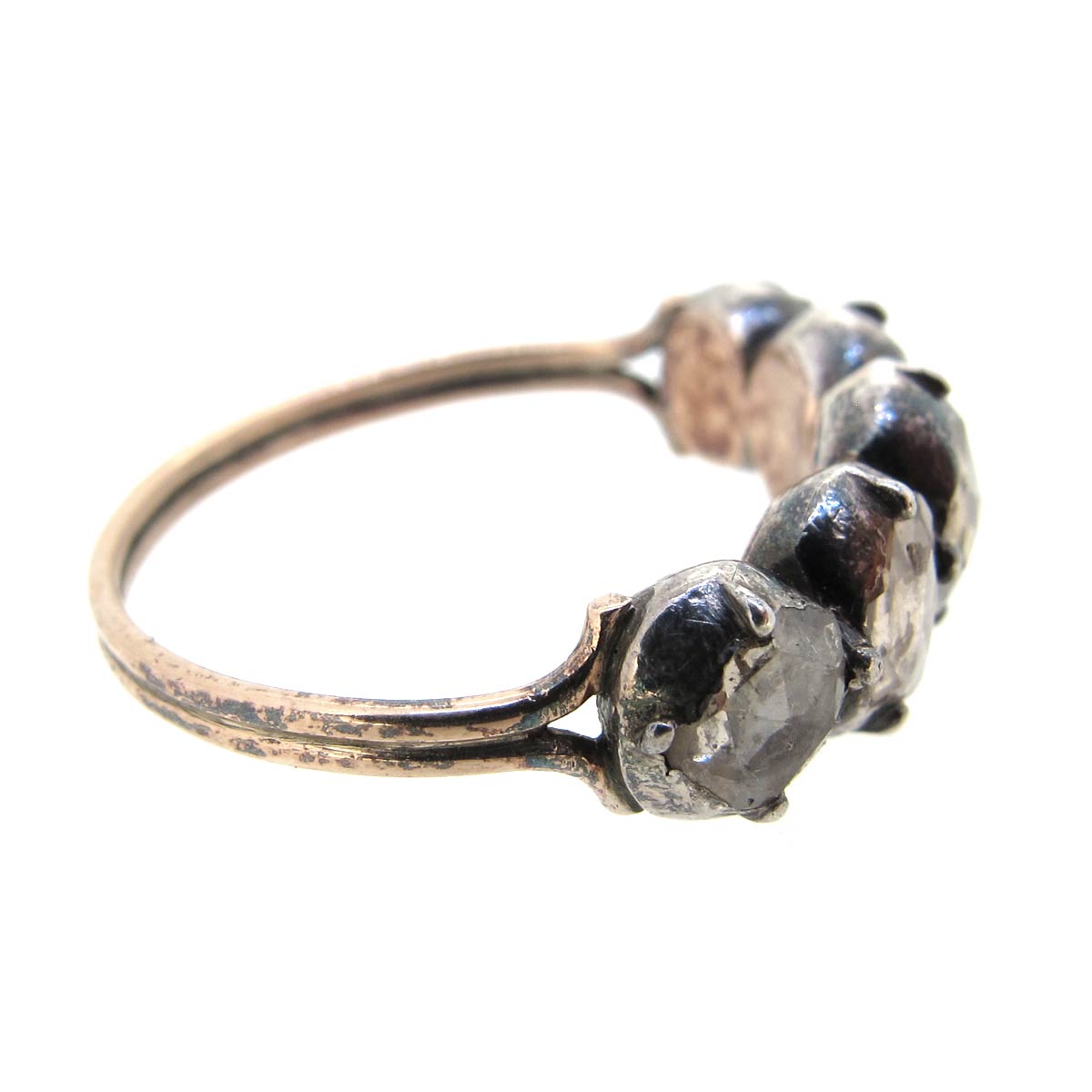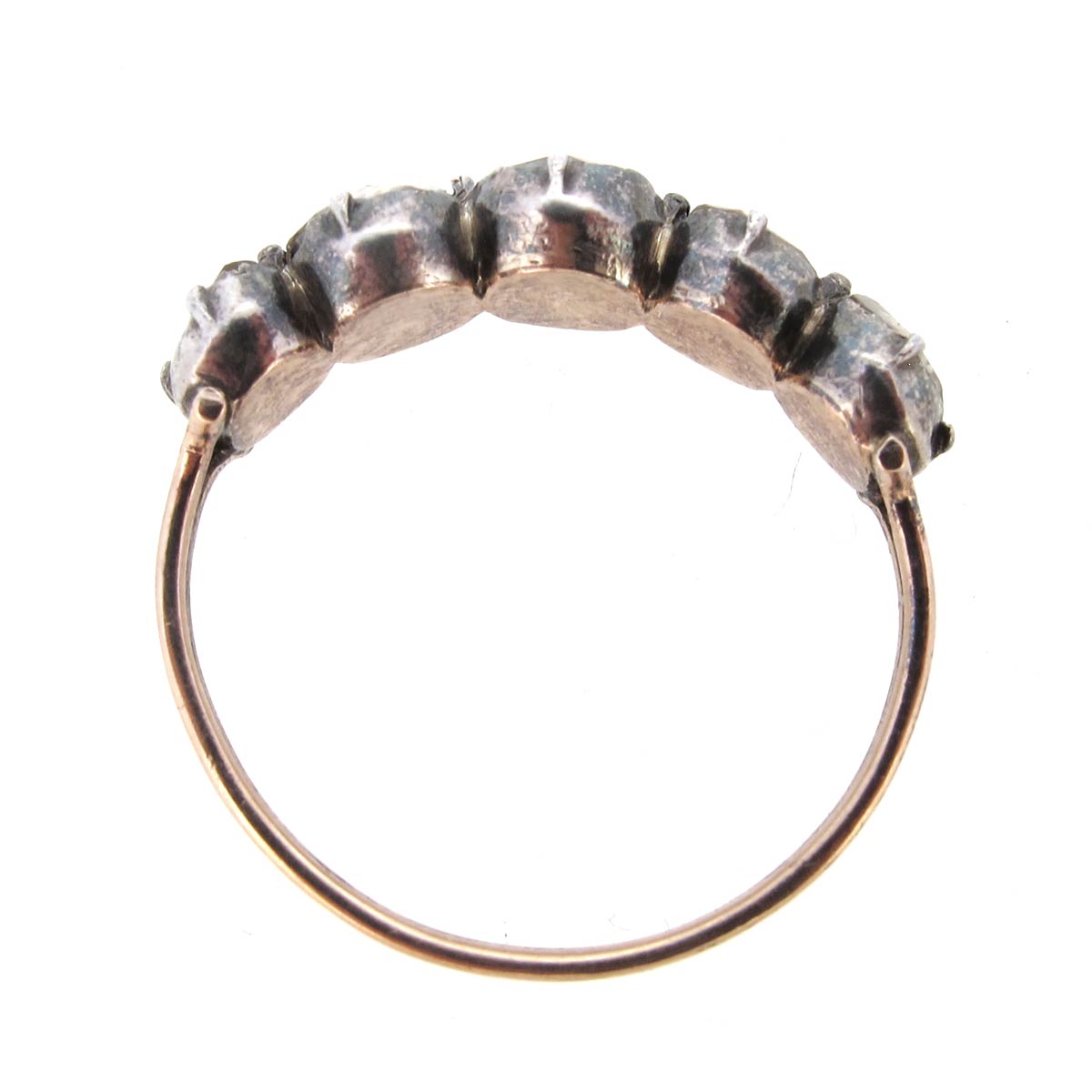 Antique Georgian 5 stone rose cut diamond ring. In a cut down collet silver on gold closed back setting.