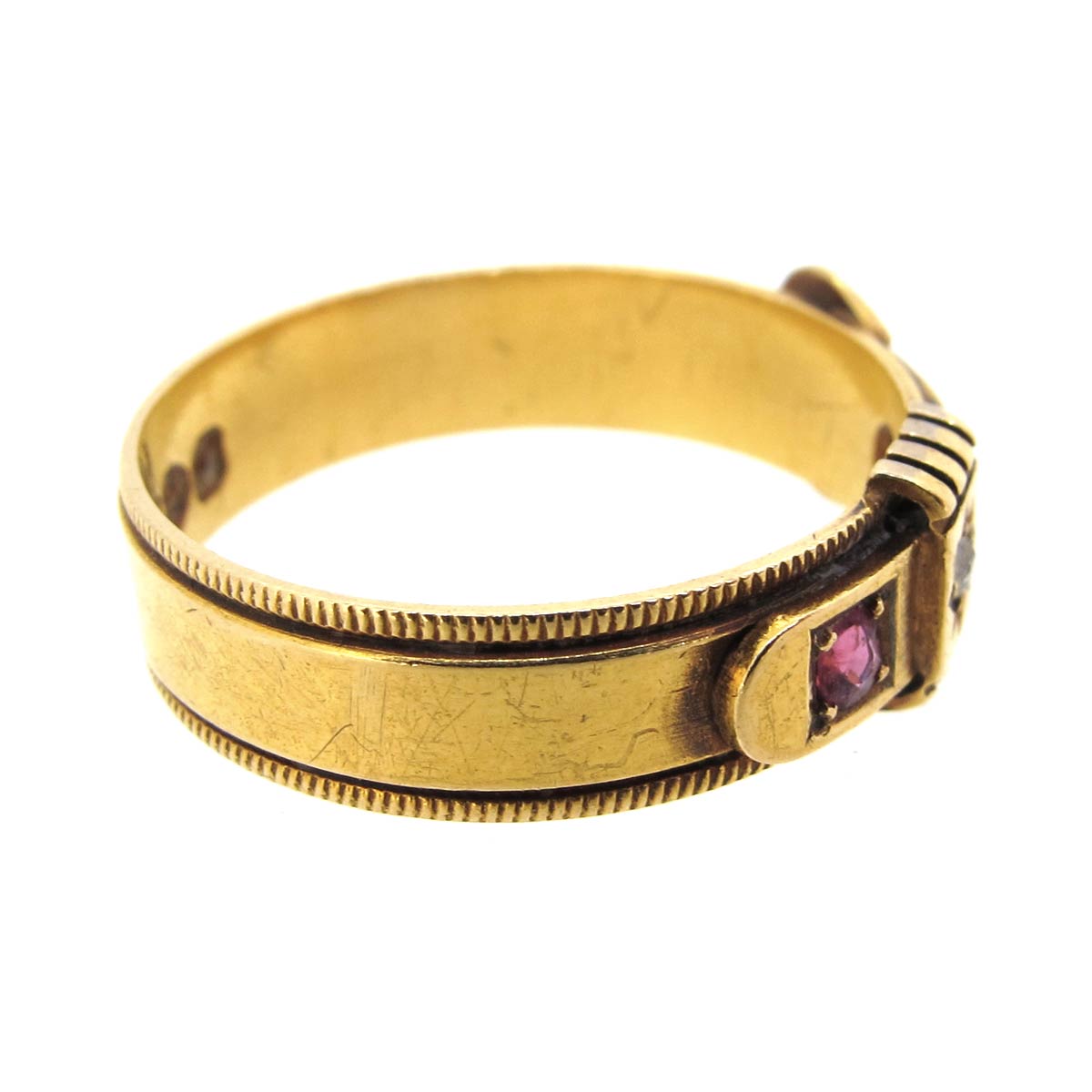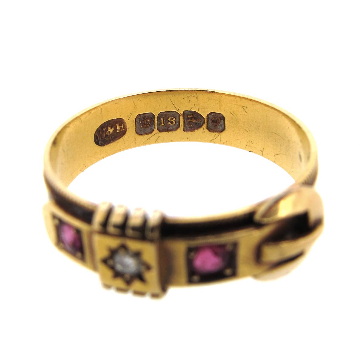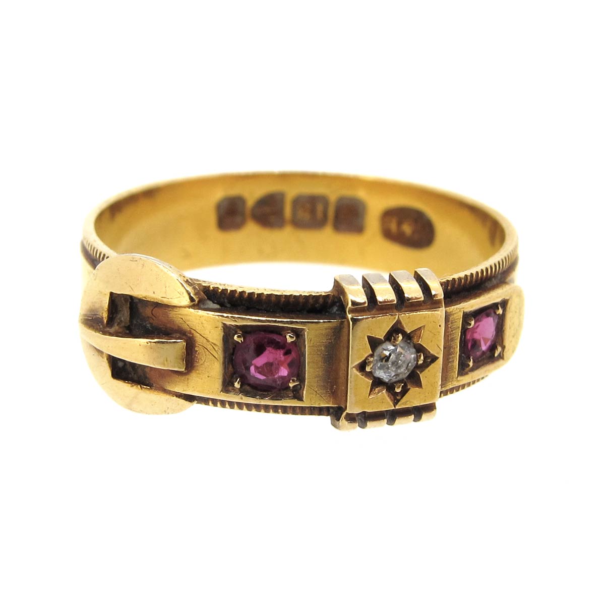 Antique Victorian 18 carat gold, ruby & diamond buckle ring. Hallmarked Chester 1899.