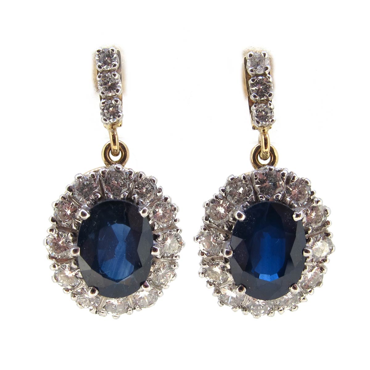 Vintage sapphire & diamond cluster drop earrings. Set in 18 carat gold. Total sapphire weight approximately 4 carats, total diamond weight approximately 2 carats.