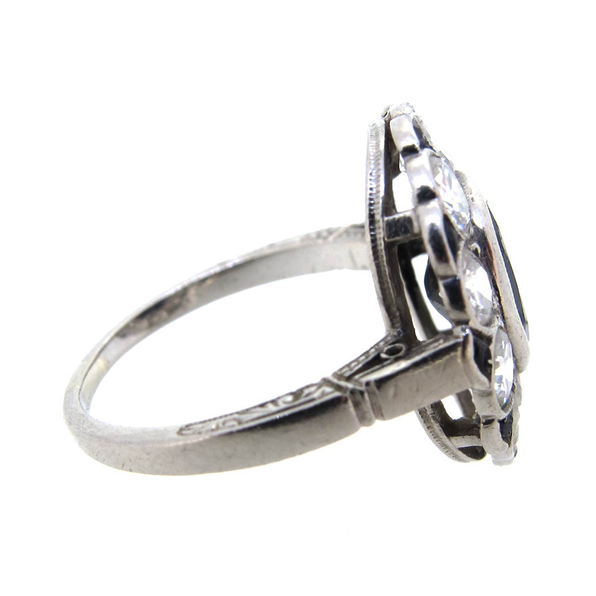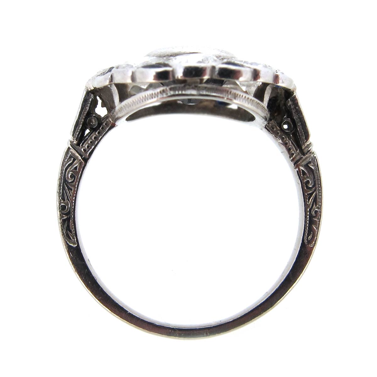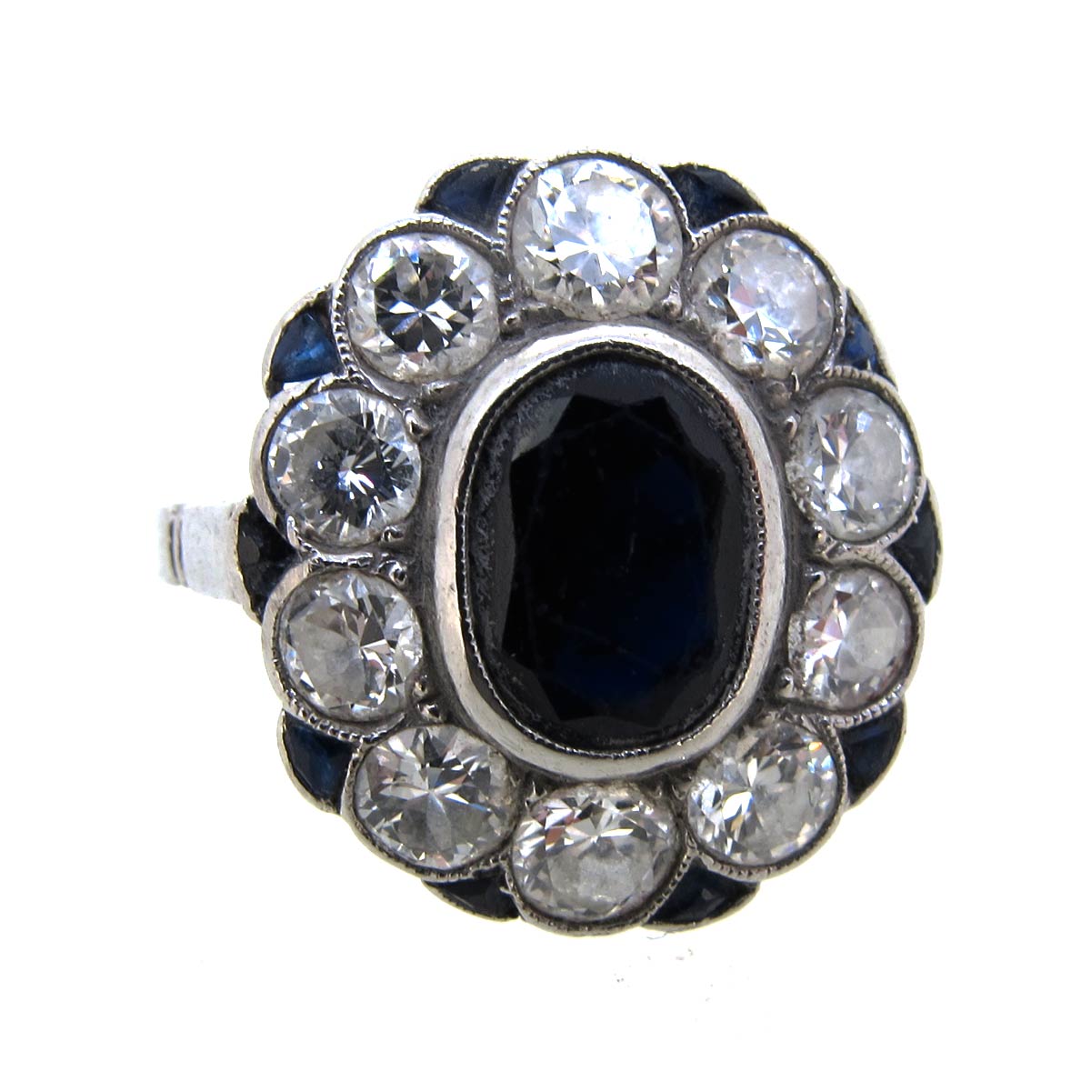 Edwardian sapphire & diamond oval fancy double cluster ring. With calibrated sapphires to the outside of the cluster. In a platinum milgrain setting with carving to the band.