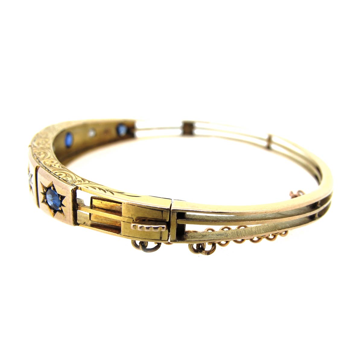 Antique Victorian 15 carat gold carved half hoop bangle. Set with sapphires & diamonds in star settings.