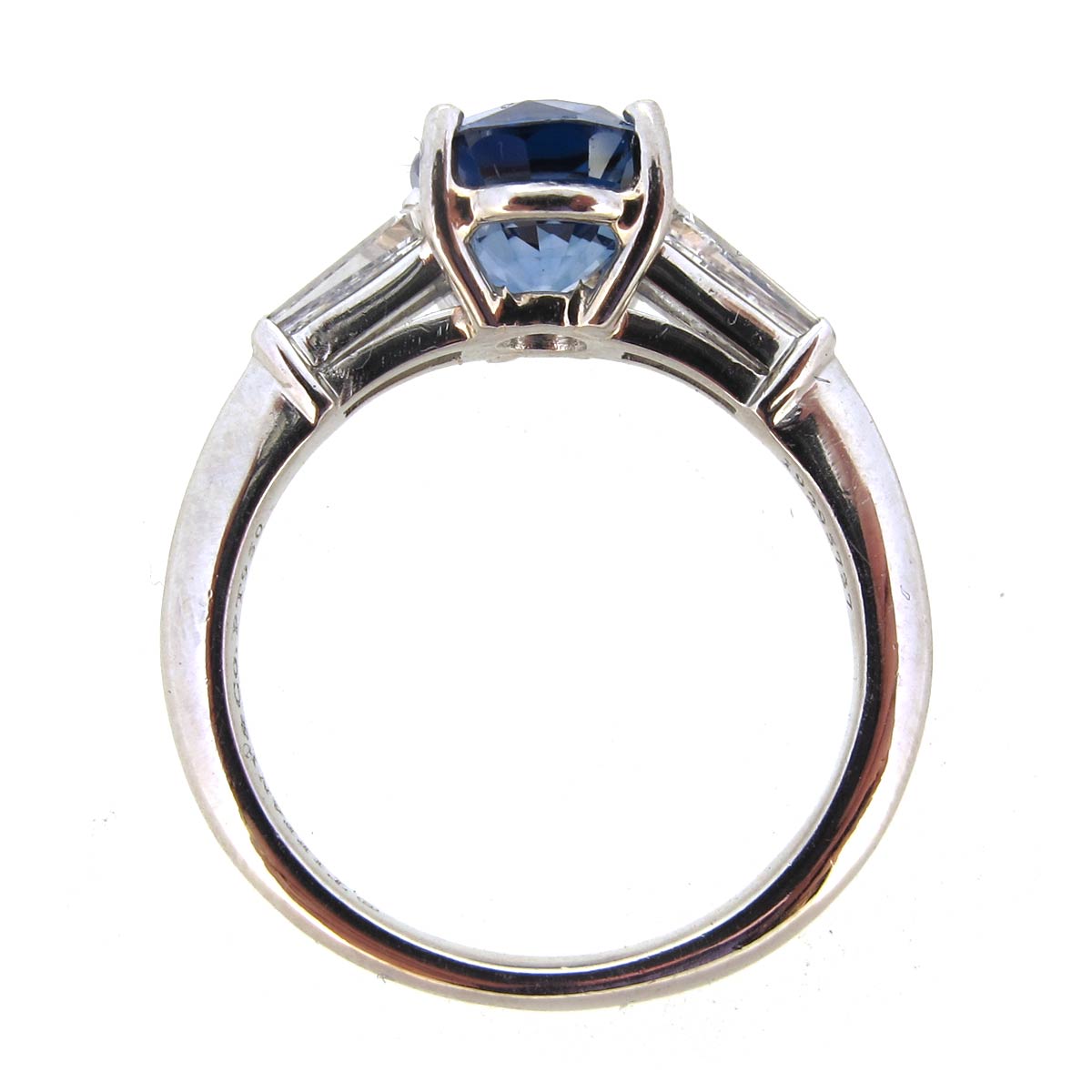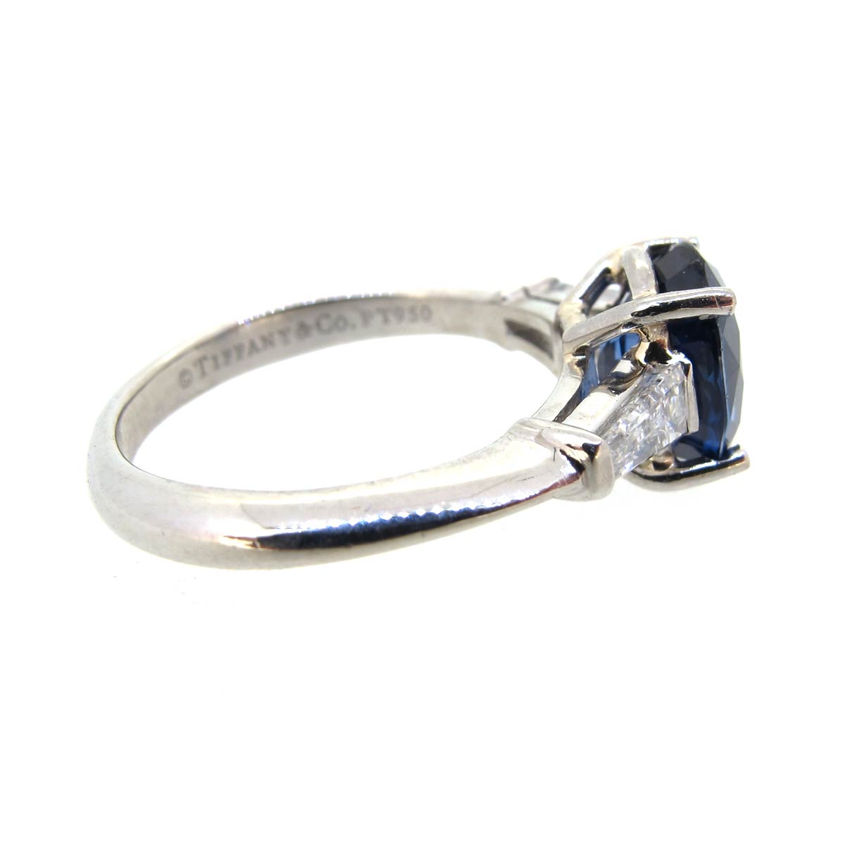 Tiffany & Co. platinum set sapphire & diamond ring. Sapphire weight 2.80 carats with a tapered baguette shaped diamond set to either shoulder.