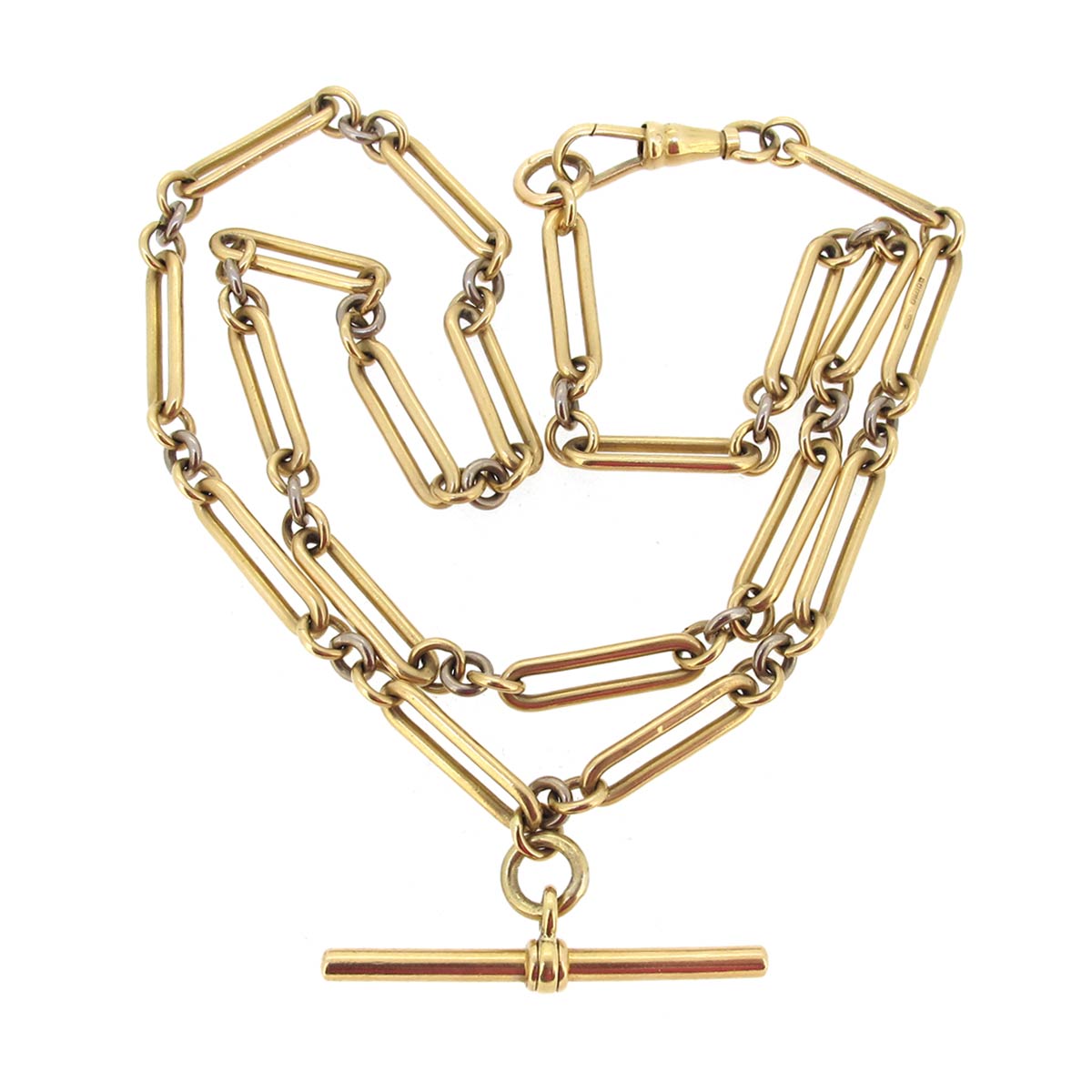18 carat gold trombone link Albert chain necklace. With T-bar & dog clip. Length 20″. Weight 37.67 grams.