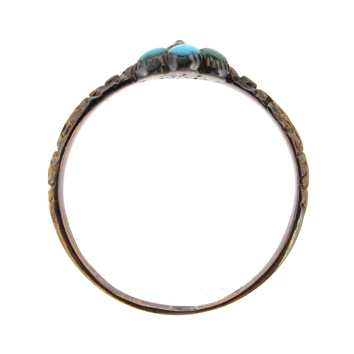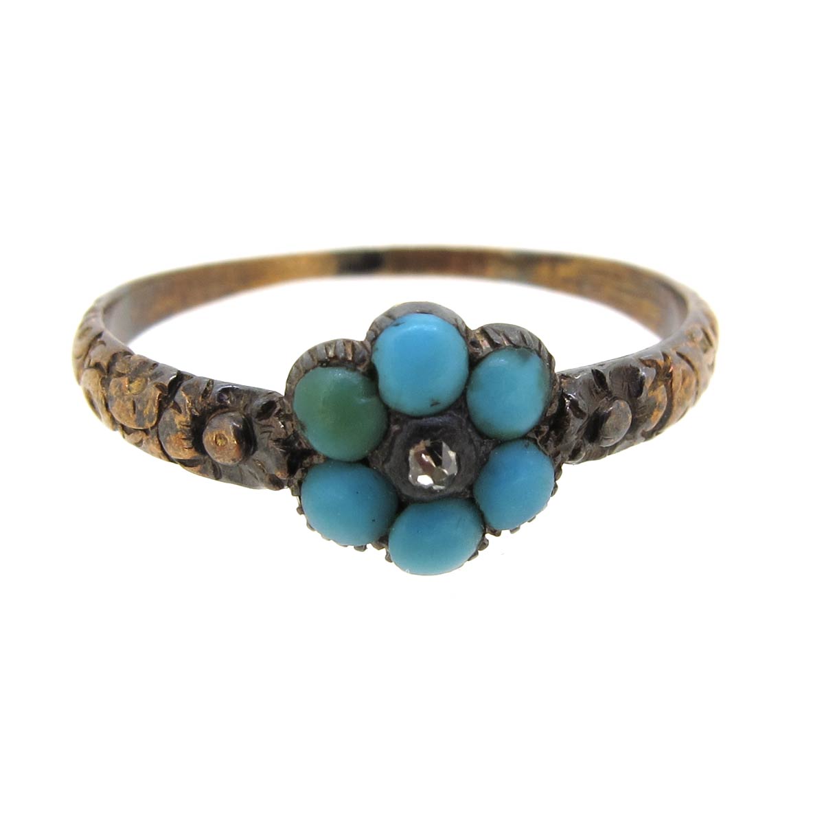 Antique Victorian turquoise daisy cluster ring with central rose cut diamond. On a carved 9 carat gold band. Inside engraving reads SH to ET.