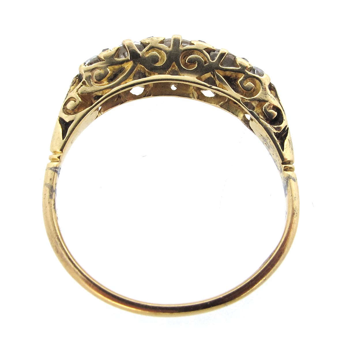 Antique Victorian carved half hoop five stone diamond ring set in 18 carat gold.