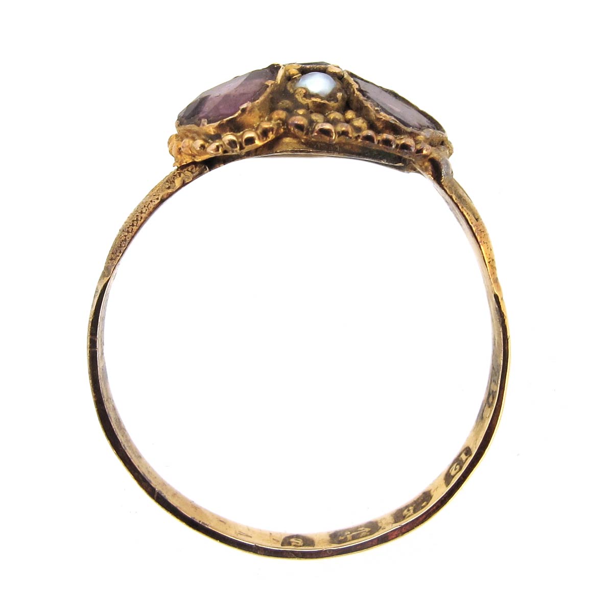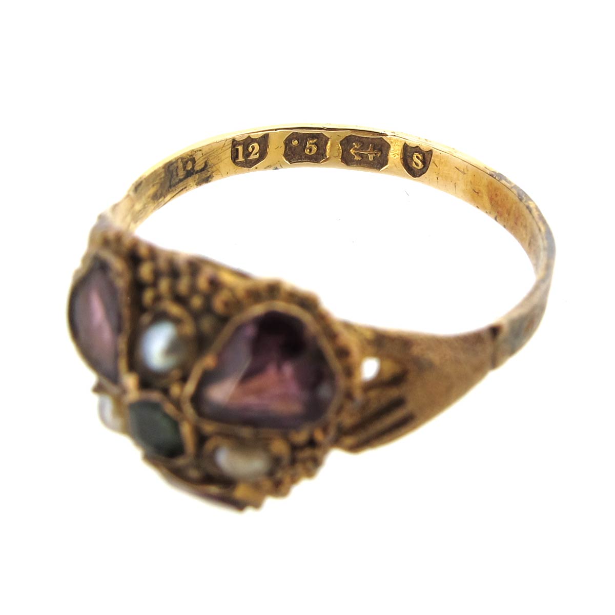 Hallmarked Birmingham, 1892, rare 12 carat gold, garnet, seed pearl & emerald clasped hands ring. Three heart shaped garnets with interspersed pearls & a central emerald making up a flower shape. With gold bead work detailing. In Victorian times gold hands holding flowers were given as romantic love tokens. With a carved gold band. Currently UK size N 1/2