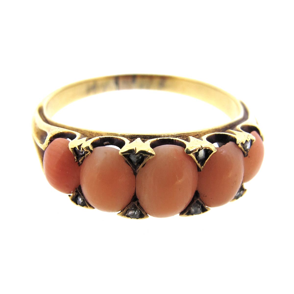 Antique Victorian 5 stone coral ring. Set in 18 carat gold with diamond accents chips.