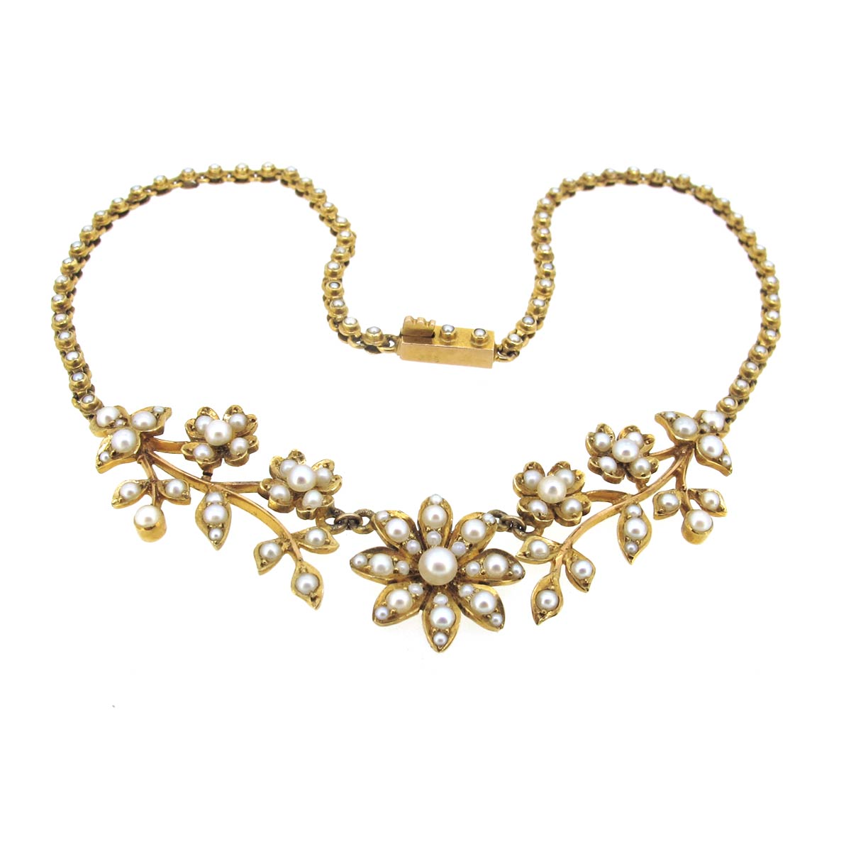 Antique Victorian 15 carat gold & seed pearl necklace. With hinged floral sections & seed pearls set around the entire chain. Length 14″.