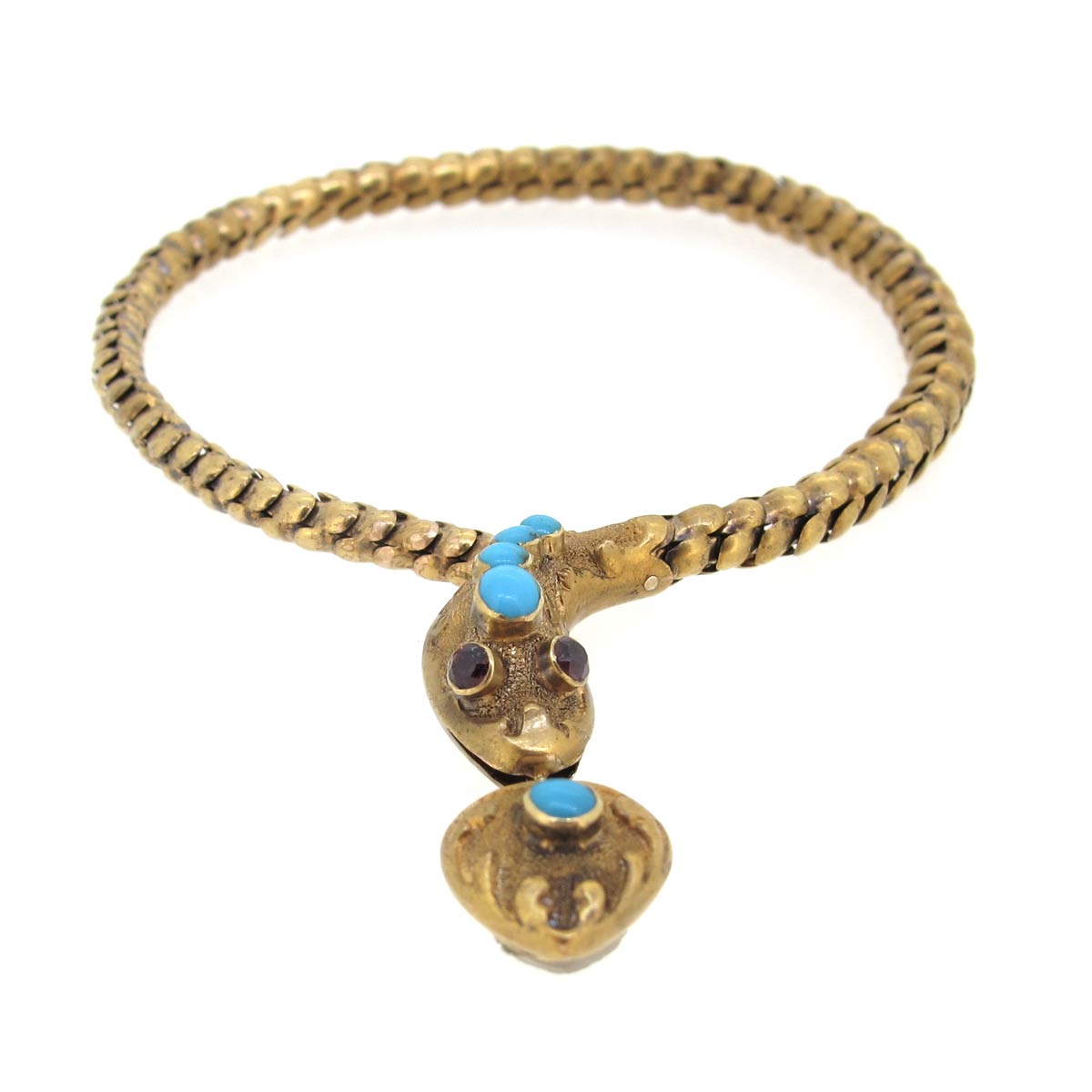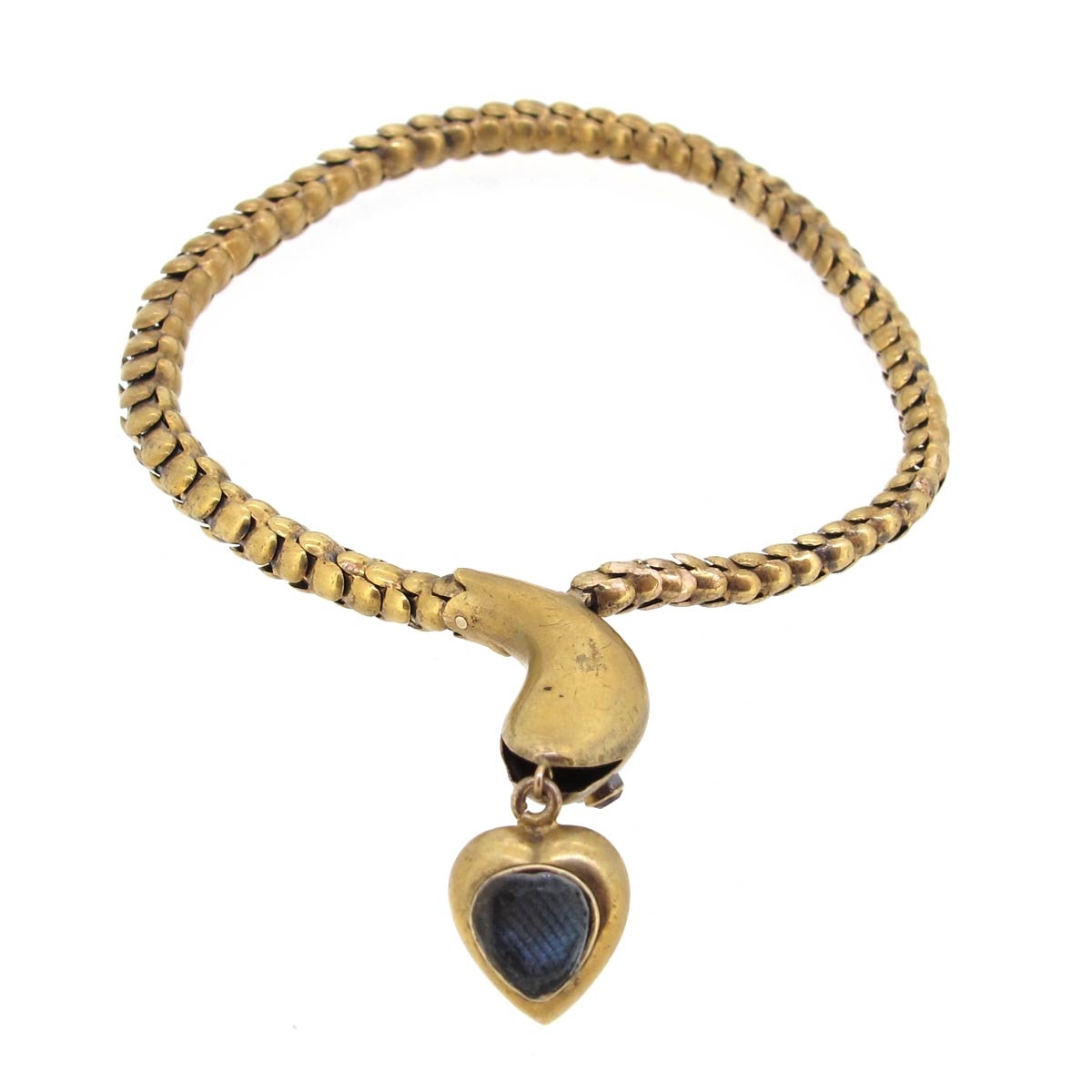 Antique Victorian 15 carat gold snake bracelet. With ruby set eyes. Turquoise set to the snake’s head & to the suspended heart open back locket.