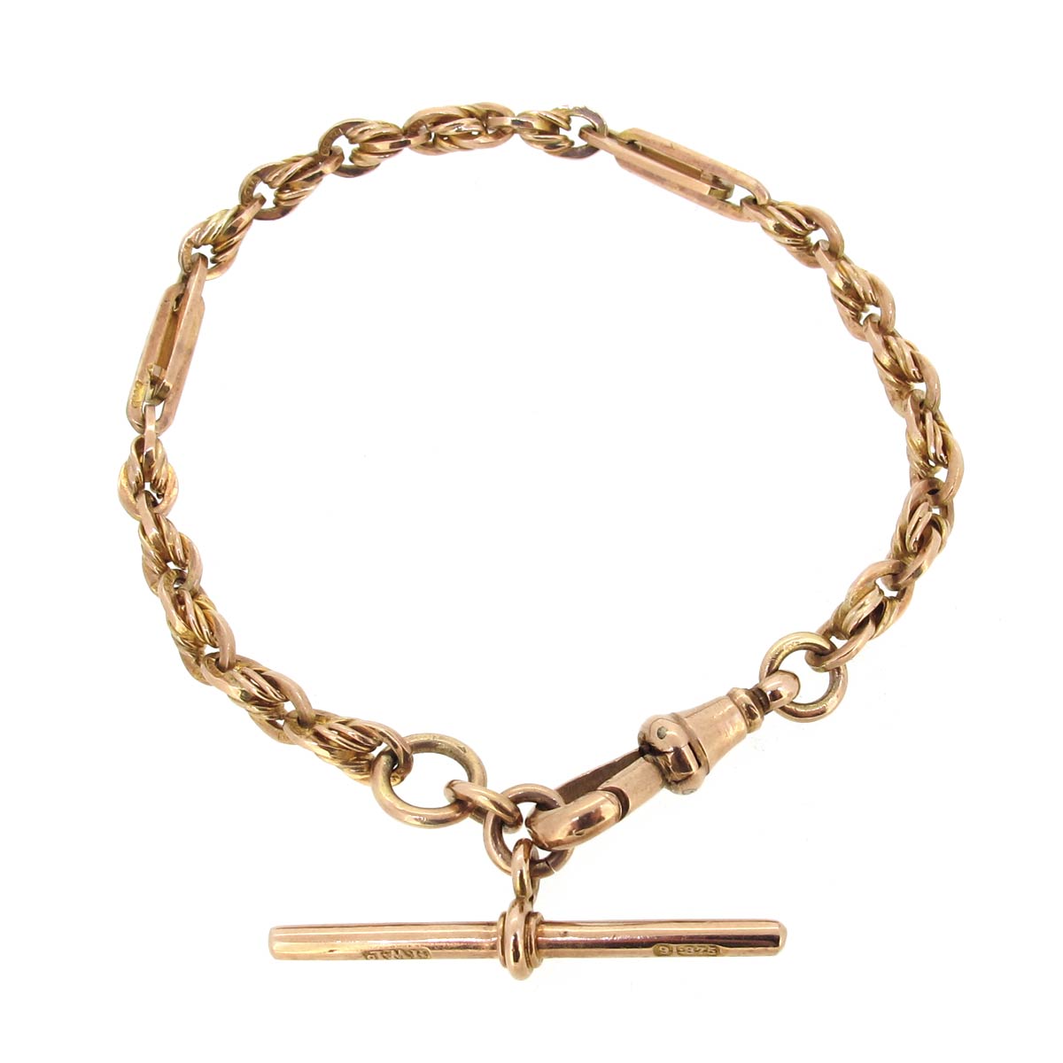 Antique Victorian 9 carat gold bracelet. With dog clip clasp & T-bar detail. Length 7″.